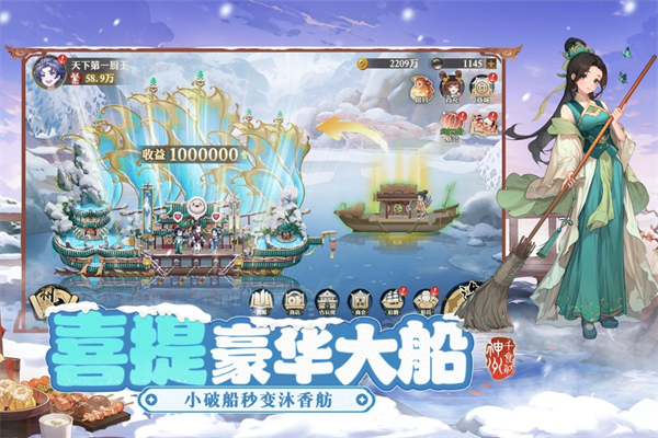 神州千食舫官方正版是一款融合了模擬經(jīng)營與卡牌養(yǎng)成兩種玩法的古風美食手機游戲。在這個游戲中,你不僅扮演一名管理者,還是一位頂級廚師。你可以通過經(jīng)營賺取收入,用這些錢來提升設施并擴展業(yè)務規(guī)模。此外,你還能招攬來自各地的美女、帥哥廚師和藝人作為你的得力助手,協(xié)助你管理美食大船。你還可以研究各種美味佳肴的配方,提升你的烹飪技藝,從而吸引更多的顧客前來享用。