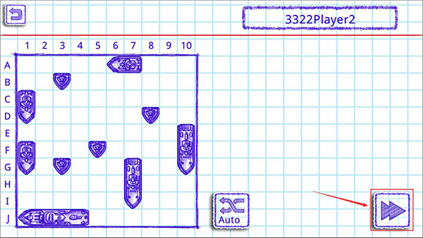3、然后就進入到了一號玩家的布陣階段,這里的話,點擊Auto按鈕可以一鍵隨機布陣,布陣完成后點擊右下角的【下一步】圖標。