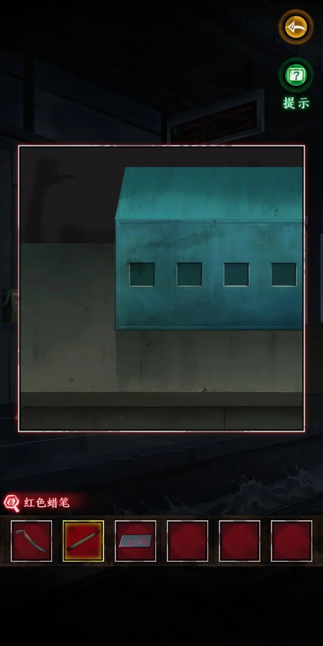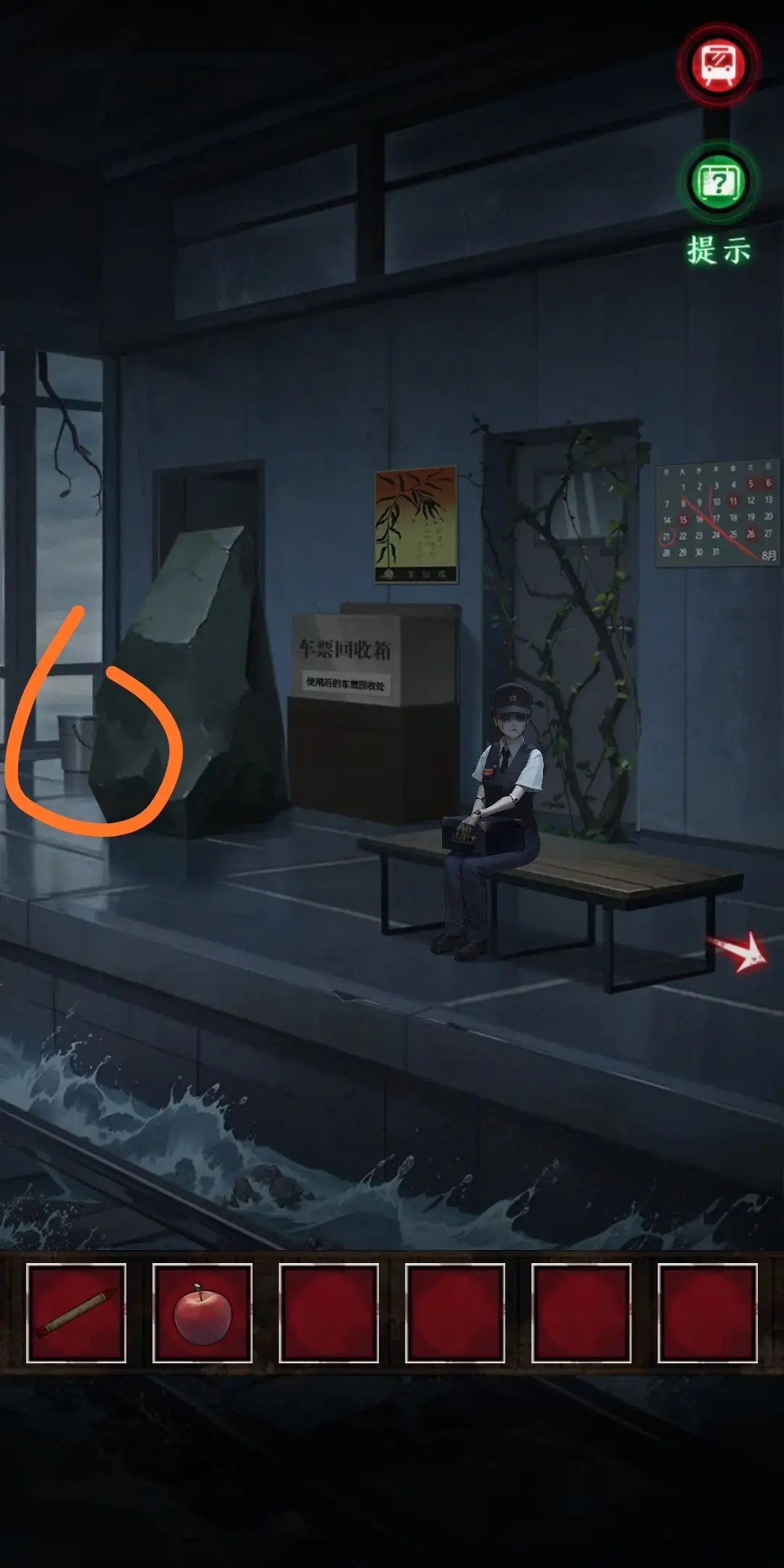 8.撿起水桶,到站臺(tái)裝滿水,對(duì)著火的車(chē)票回收箱使用,連線,得到黑蠟筆和空水桶