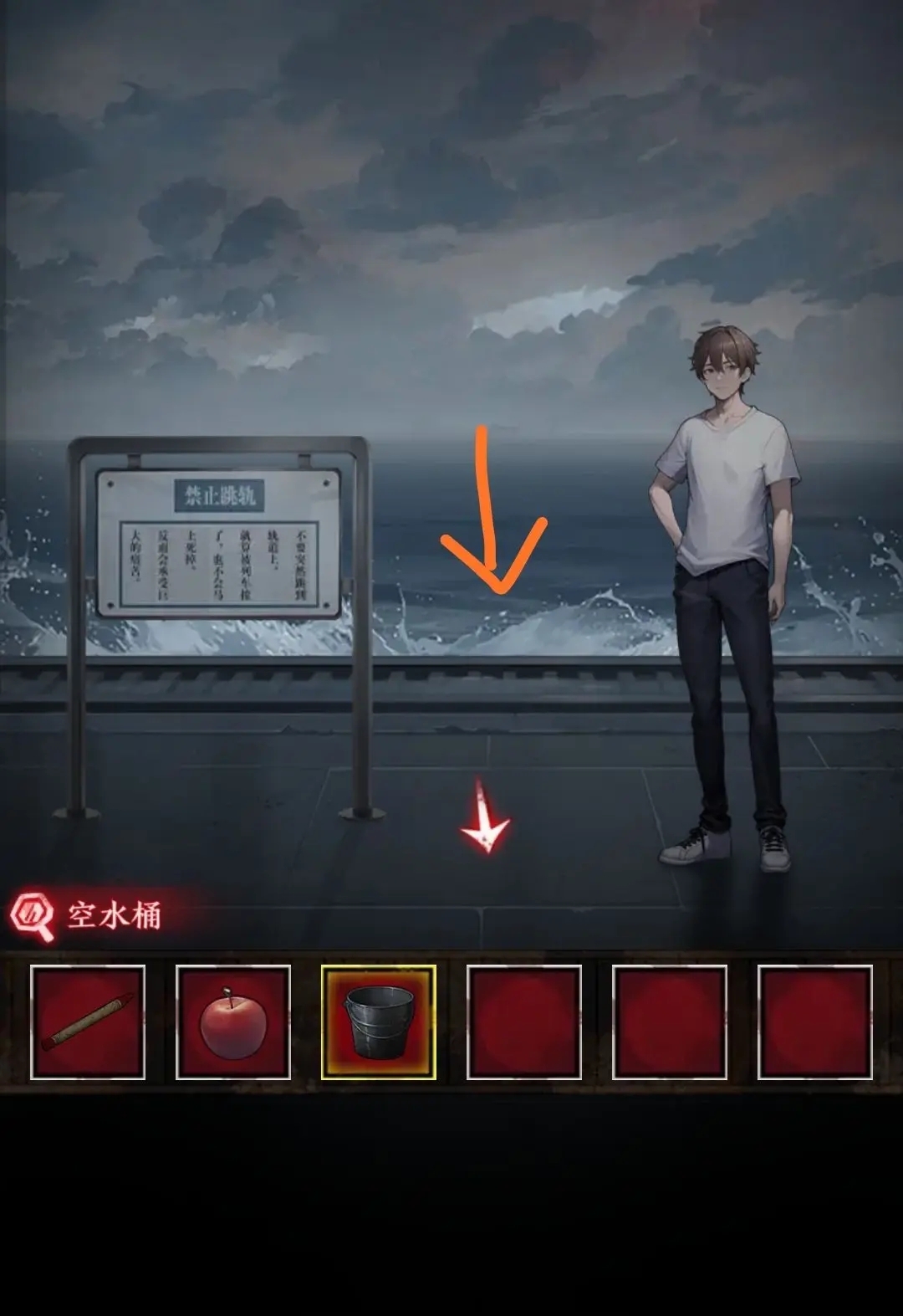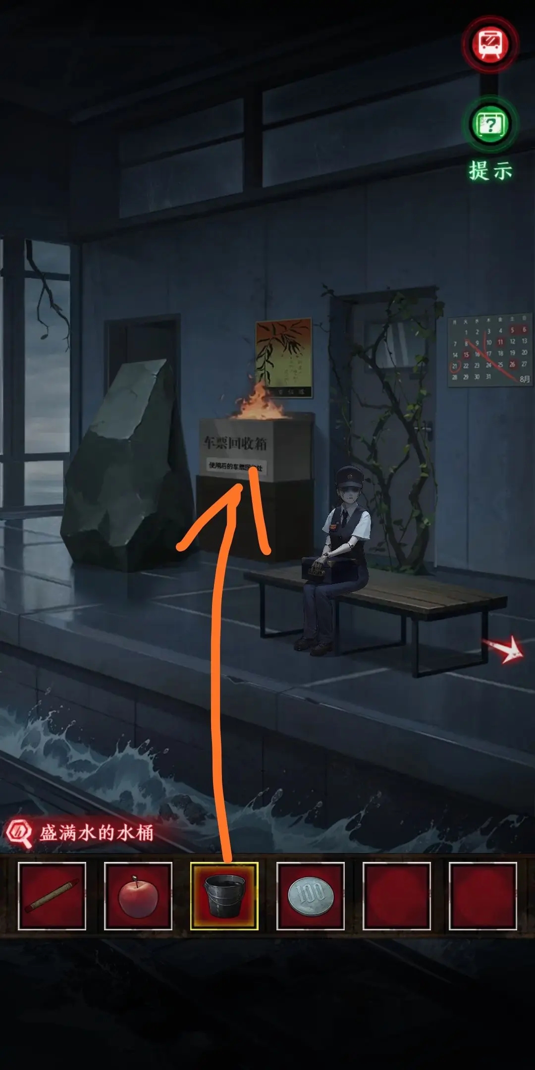 13.繼續(xù)用空桶去站臺(tái)裝水,得到一桶水,根據(jù)筆記本里的記錄,對(duì)桶使用火柴,然后再使用蘋(píng)果