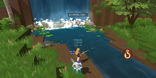 3、此時(shí),右手邊會(huì)出現(xiàn)魚鉤圖標(biāo),頭頂則會(huì)出現(xiàn)浮標(biāo),這一階段處于等待狀態(tài)。當(dāng)頭頂?shù)膱D標(biāo)變成綠色魚圖標(biāo),且魚鉤也變?yōu)榫G色時(shí),就能夠點(diǎn)擊魚鉤進(jìn)行釣魚操作(注意,魚上鉤后要盡快點(diǎn)擊魚鉤,不然魚就會(huì)脫鉤)。