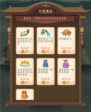 這里的軍糧和銅幣都是過(guò)關(guān)斬將的獨(dú)有道具,并且會(huì)隨著過(guò)關(guān)斬將的刷新而自動(dòng)重置,因此大家不用擔(dān)心某次軍糧或者銅幣用多了,下次就不夠的問(wèn)題。所以個(gè)人建議在保障抵達(dá)終點(diǎn)的前提下,可以用多余的銅幣購(gòu)買(mǎi)錦囊、提高隊(duì)伍的戰(zhàn)斗力。當(dāng)然補(bǔ)給商店的商品也和軍糧、銅幣一樣,會(huì)在刷新時(shí)自動(dòng)重置。