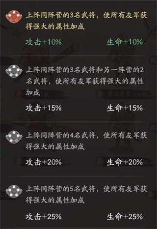 陣營(yíng)羈絆需要上陣3名或以上的同陣營(yíng)武將,就可以獲得至少10%的攻擊力和生命值加成。
