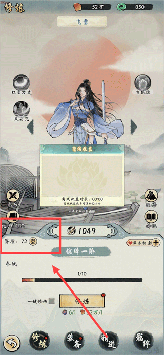 ⑤關(guān)于紅顏與道侶,沒啥太多可說的。直接氪金,先購買好感道具,給每個人花費50。完成主線任務(wù)24后,立刻前往宗門逐個結(jié)識。隨后氪金購買洗髓液來洗練資質(zhì),至少要平均達到80,增速為“600/5秒”。(這個時候修為大概處于練氣三四五六層,由于秘法開啟時間比這更早,要是氪金提升的那項已升滿,等級就會比較高。平均80資質(zhì),要是還想更高,可以繼續(xù)氪金洗練,滿資質(zhì)是100點,80資質(zhì)再往上提升的話,增速會比600多幾十到一百多 )