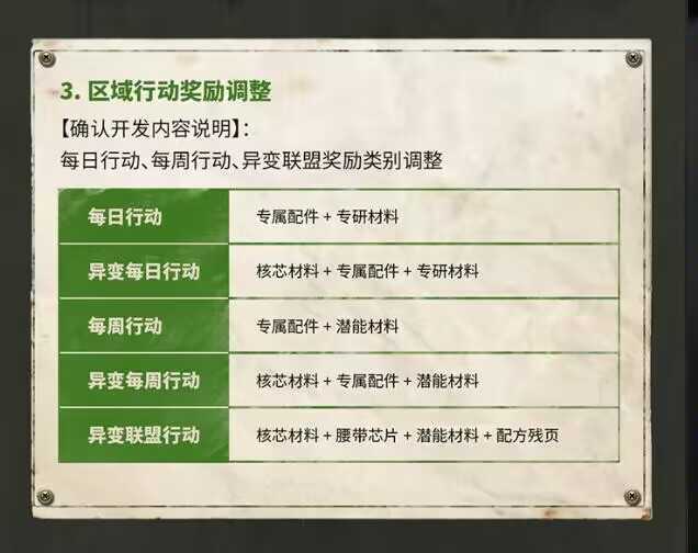 盡管活動(dòng)數(shù)量有所減少,然而大家每日的收益并未出現(xiàn)顯著降低。日常執(zhí)勤寶箱里,配方殘頁(yè)的數(shù)量大幅增加,有效解決了我們抽取配方困難的問(wèn)題。與此同時(shí),區(qū)域行動(dòng)的獎(jiǎng)勵(lì)也得到了大幅改善,從中我們能夠獲取多種材料、芯片甚至配方殘頁(yè)(具體詳情如下圖所示),助力我們迅速提升戰(zhàn)斗力。