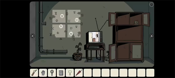 一個放置在柜子上的玻璃酒杯悄無聲息地在你眼前從右邊移動到了左邊,你覺得有些驚悚,但還是拿走了它。打開唯一沒有上鎖的柜門,里面又是一張相片,和之前那張一樣,也是從屋里往外拍攝的,仍舊是那個藍衣男人,他走在路上讀著報紙。日期是星期五下午四點三十九分,下方寫著“他在假裝讀報紙”。電視機的電源線斷掉了,旁邊是花盆,你發(fā)現(xiàn)花盆的花紋和之前的那盆不太一樣。墻上有很多畫符,一旁還有粗大的管道,管道拐彎的地方破了一個洞,你靠近往里看去,竟然看到里面有雙眼在瞪著你,那雙眼眨了幾下就消失了,露出一把鑰匙,可是你夠不著它。
