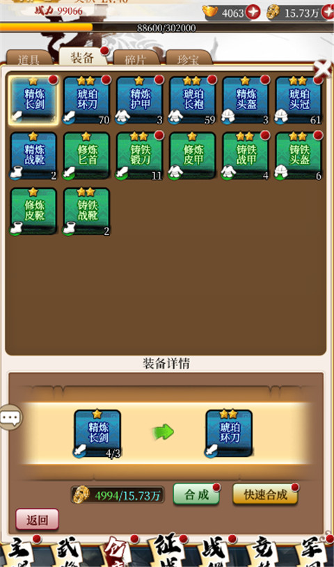裝備可以通過通關(guān)征戰(zhàn)關(guān)卡等渠道獲取,獲取后可以在倉庫背包里的裝備欄里合成更高星級的裝備