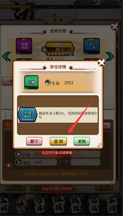 要是主公大人對合成的珍寶屬于不滿意的話可以選擇該珍寶繼續(xù)重鑄裝備從而來更換屬性!!