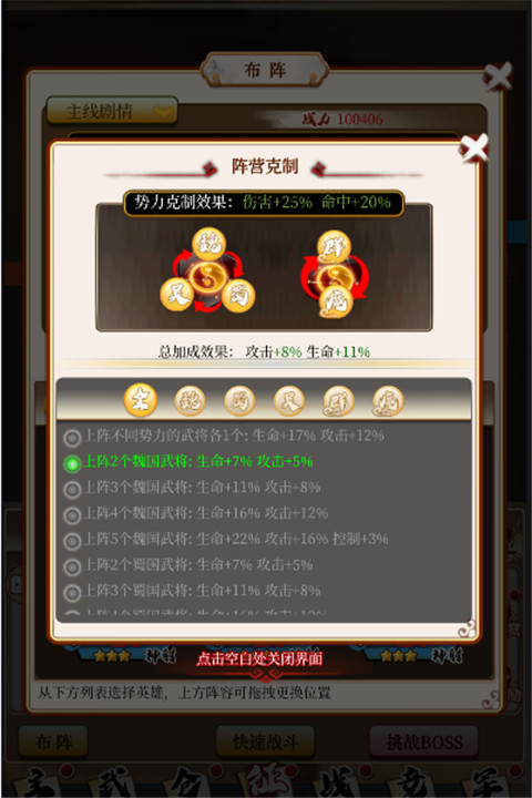 最后就是陣營的克制關(guān)系啦也是影響戰(zhàn)局勝負非常重要的因素之一,吳國武將克制魏國武將、魏國武將克制蜀國武將、蜀國武將克制吳國武將、群雄武將與魔道武將形成互相克制的關(guān)系,當(dāng)然啦相同陣營的武將上陣也是有著對應(yīng)屬性羈絆的加成!