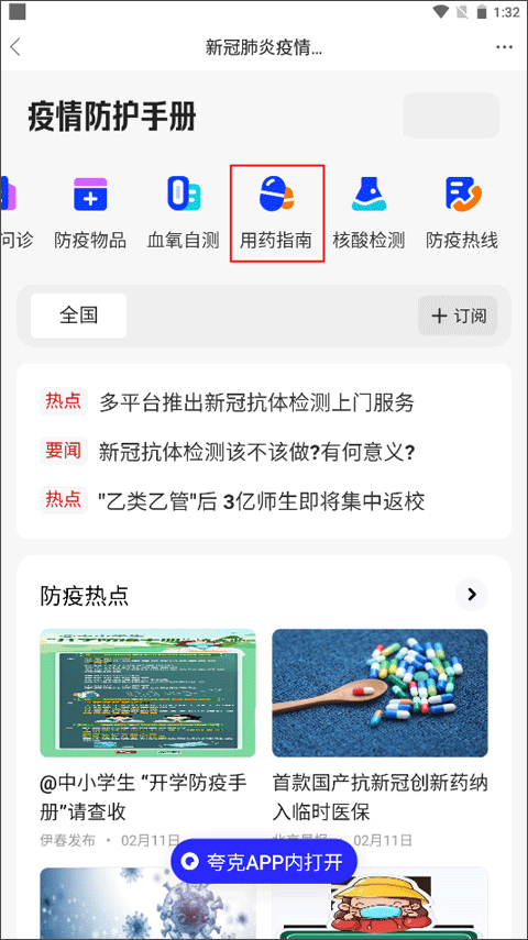 在疫情防護(hù)手冊中向右滑動,你會看到一個用藥指南功能選項;