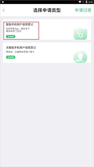 2、存在兩種申請類型,筆者這里選取的是智能手機用戶登記,包括多種開門方式如手機APP、身份證等,操作簡便快速: