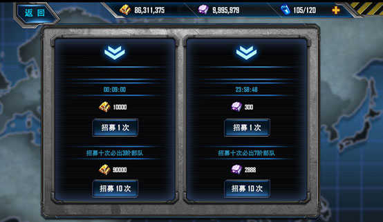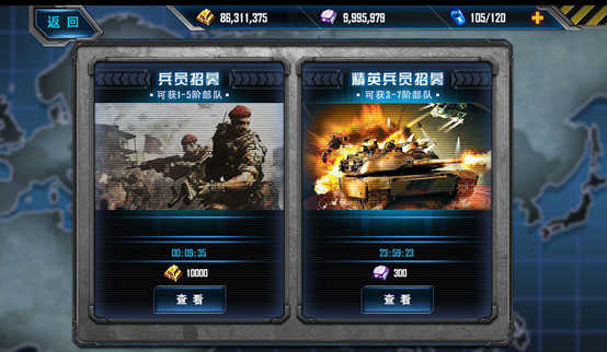 兵員招募花費(fèi)金條,可獲得1-3階部隊(duì);精英兵員招募花費(fèi)鉆石,可獲得5-7階部隊(duì)。