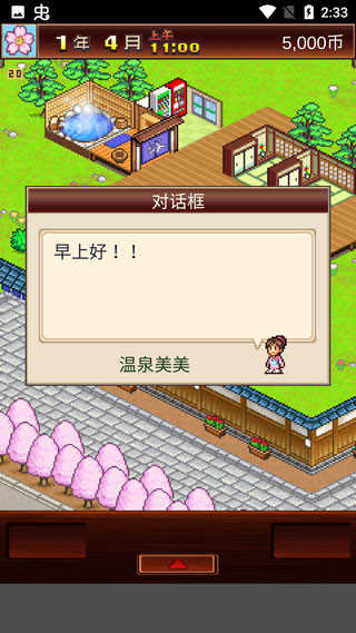 進入游戲后,玩家首先看到的是已經安置好的溫泉、和式房間、自動販賣機、前臺和兩棵松樹。空地,即可建設面積其實并不大,但是對囊中羞澀的各位新手來說已經足夠了。