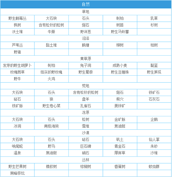 在游戲中自然環(huán)境是左右玩家生存的一個重要的關(guān)鍵點,一小時人生的游戲自然環(huán)境分布主要有七大部分,分別是草地,沼澤,黃草原,荒地,凍原,沙漠,叢林,那我們都來看看在這些地方都有什么可以提供合成,提供生存的資源吧!