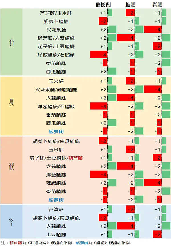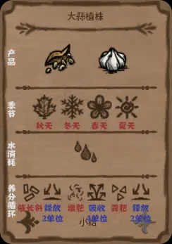 每個農(nóng)作物的產(chǎn)品下面有三欄介紹,其中第一欄為適宜生長的季節(jié),第二欄為水消耗,第三欄為養(yǎng)分循環(huán)。在養(yǎng)分循環(huán)中,每種農(nóng)作物生長過程中都會涉及到三種養(yǎng)分,從左到右依次為:催長劑、堆肥、糞肥,每種養(yǎng)分后面有箭頭,箭頭向下表示向土地釋放,向上表示從土地中吸收,并且1個箭頭表示每個生長階段結(jié)算時吸收或釋放1個單位,2個箭頭表示吸收或釋放2個單位,以此類推。