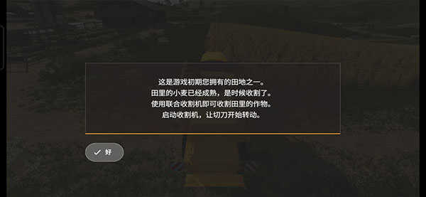 正式進(jìn)入游戲,眼前就是我們的農(nóng)場,首先接觸到的內(nèi)容就是“收割”,眼前已經(jīng)有一片成熟的麥地,以及一臺new holland紐荷蘭收割機(jī),具體各個(gè)圖標(biāo)含義見下圖: