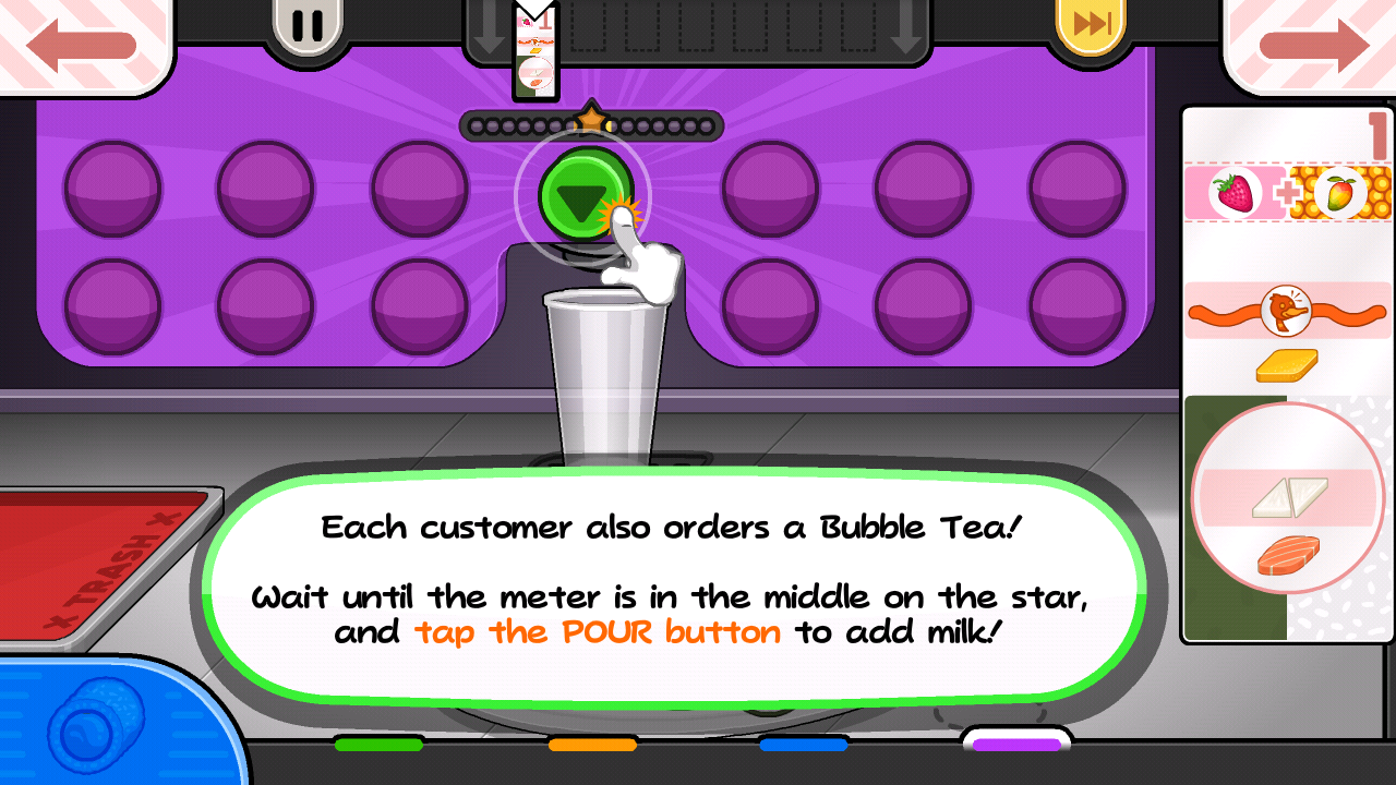 冷飲店:最早登陸手機(jī),應(yīng)該也是最早一款得分點(diǎn)為拿起配料均勻噴灑的游戲,只有左右兩個(gè)方向所以相對(duì)好控制,更容易在造型上拿高分,缺點(diǎn)是攪拌機(jī)時(shí)間太長(zhǎng),和其他步驟不好配合煎餅店:個(gè)人不太喜歡的一款,得分點(diǎn)包括高處扔餅和圓形對(duì)稱澆汁,而且圓形還是側(cè)面俯視視角,判定非常迷,基本上除了教程就沒(méi)得過(guò)高分。