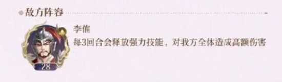 敵方陣容:李催(每3回合會釋放強力技能,對我方全體造成高額傷害)