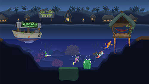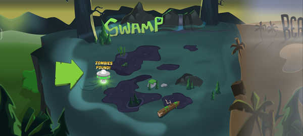 游戲中綠皮怪與機(jī)器人小伙伴駕駛著一艘飛碟到一片沼澤中尋找外星人的蹤跡,當(dāng)飛碟停止時(shí),就可以降落開始進(jìn)行抓捕僵尸的游戲了;