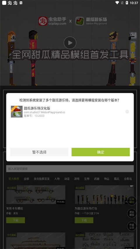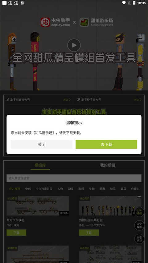 首先進(jìn)入蟲蟲助手甜瓜游樂(lè)場(chǎng)模組工具,如果沒(méi)有下載甜瓜游樂(lè)場(chǎng)就要先下載安裝,這里小編是沒(méi)有下載的,所以這里點(diǎn)擊去下載;