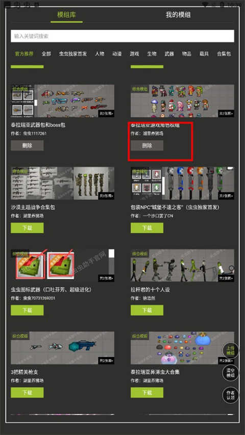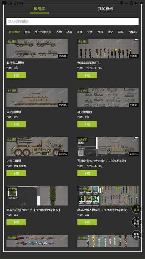 然后在模組庫(kù)中玩家可以選擇自己想玩的,這里有多種模組可以選擇,如:人物、動(dòng)漫、游戲、生物、武器、物品、載具、合集包、戰(zhàn)爭(zhēng)、超級(jí)英雄、建筑等等,玩家也可以自己上傳模組和網(wǎng)友們共享;