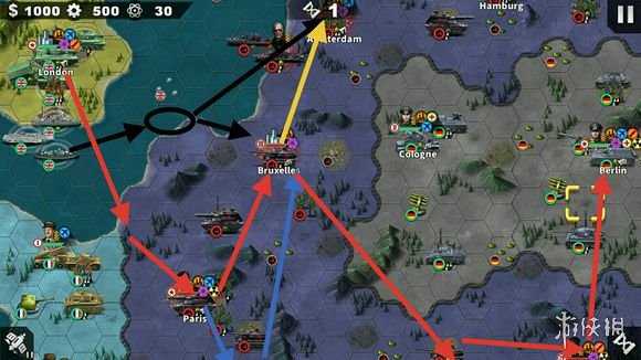 右上角城中的守將離開后,大部隊(duì)開始攻城。隨后分兵,古帥帶領(lǐng)輕坦按照藍(lán)色路線進(jìn)城清理小兵,不用理會(huì)對(duì)面的坦克將領(lǐng)。大部隊(duì)占領(lǐng)德黑蘭并暈住兩個(gè)將領(lǐng),留下一個(gè)謠言將領(lǐng)持續(xù)暈眩。大部隊(duì)與古帥在布拉格會(huì)合,并消滅那個(gè)坦克將領(lǐng)。(優(yōu)先攻擊進(jìn)城的將領(lǐng))