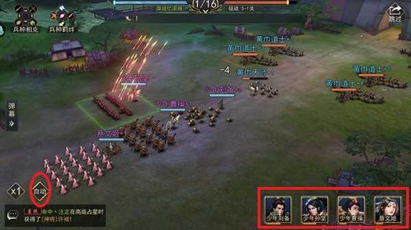在戰(zhàn)斗過程中,武將的怒氣值會提升,當武將頭像發(fā)亮時即可點擊釋放武將技能,也可以點擊左下角自動,武將就會自動釋放技能。
