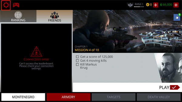 雙擊打開代號47狙擊中文版游戲,點擊左上角的齒輪按鈕;