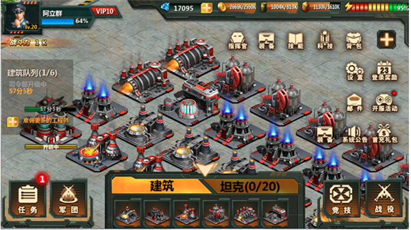 界面主要分為4個(gè)區(qū)域:畫面左上角為玩家屬性,右上角是功能以及玩家財(cái)富,左下角為任務(wù)和軍團(tuán),右下角是競(jìng)技場(chǎng)以及戰(zhàn)役展示。