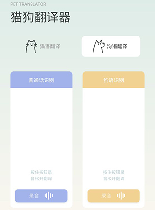 用戶在首頁可以直接使用狗語和貓語翻譯器,將你想說的話點擊錄音即可自動翻譯并且播放,以及狗狗或者貓貓說的話錄下來進行翻譯。