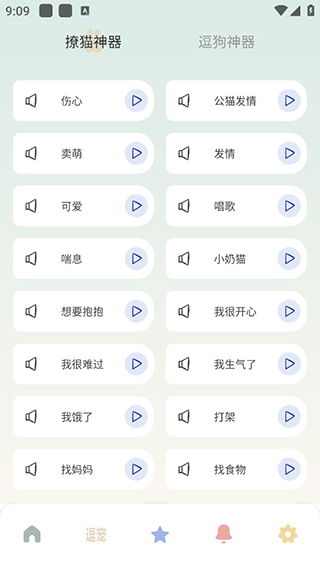 用戶點擊下方寵物爪印圖標即可進入逗寵頁面,里面有撩貓和逗狗神器,有許多貓貓狗狗的語言錄音,可以播放使用。