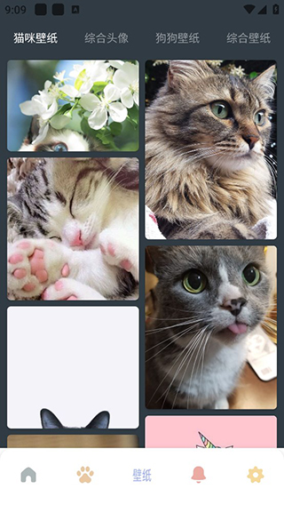 用戶點擊下方五角星按鈕即可進入壁紙界面,有貓咪壁紙、綜合頭像、狗狗壁紙、綜合壁紙等壁紙內(nèi)容可以下載使用。
