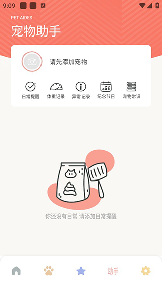 用戶點擊下發(fā)鈴鐺圖標即可進入助手頁面,點擊可以添加寵物,可以記錄寵物的體重、異常等,還可以查看寵物常識。