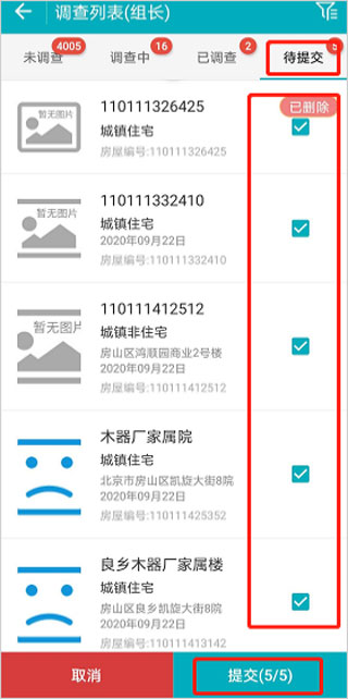 13、也可通過右上角的【調(diào)查進度列表】進入【待提交】列表,“長按”可切換為選擇模式,選中需要提交的數(shù)據(jù),點擊【提交】可完成數(shù)據(jù)提交。