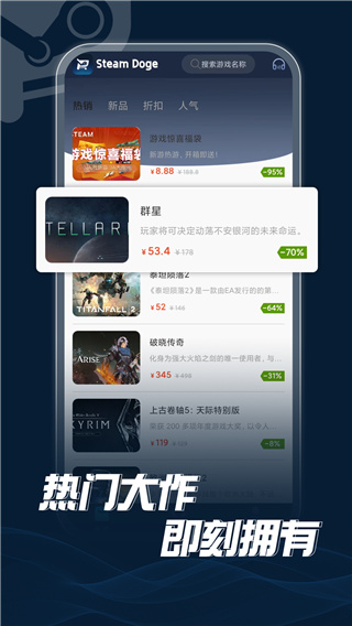 想了解最新的Steam游戲折扣嗎?可以嘗試一下這個 SteamDoge商城 ,這是一款官方正版授權(quán)的Steam商城,也是專門為Steam游戲愛好者設(shè)計的折扣平臺。在這里不僅可以購買游戲或游戲道具,還可以實時獲取最新的游戲折扣信息。無論是新發(fā)布的游戲還是熱門游戲,甚至是較為冷門的游戲,都會收錄在SteamDoge商城中。只需在搜索框內(nèi)精確查找,就能找到目標。 此外,用戶無需在 SteamDoge商城登錄Steam賬號,使用手機號驗證碼登錄即可,這樣省去了登錄Steam賬號的復雜步驟。一些用戶可能會疑惑,不登錄Steam賬號怎么購買游戲呢?其實不用擔心,購買成功后,系統(tǒng)會自動跳轉(zhuǎn)到購買成功的頁面,在該頁面復制激活碼信息,然后在Steam客戶端進行兌換就可以了。
