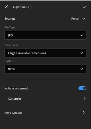 選擇預(yù)設(shè)選項以將您的照片快速導(dǎo)出為 JPG(?。?、JPG(大)或原始圖像。