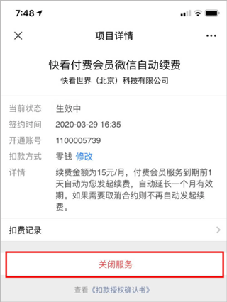登錄付款的微信賬號,「我」→「支付」右上角→點(diǎn)擊「...」→「扣費(fèi)服務(wù)」中找到“快看付費(fèi)閱讀會員”,點(diǎn)擊「關(guān)閉服務(wù)」即可。