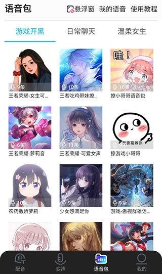 用戶在語音包界面可以選擇游戲開黑、日常聊天、溫柔女生三大語音包進行使用,只需要打開懸浮窗功能即可快捷使用。