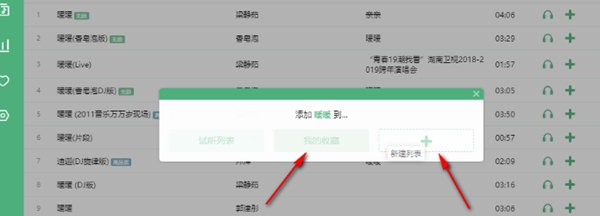2.在彈出的窗口中你可以將歌曲添加到【我的收藏】或者直接在后面的加號(hào)中點(diǎn)擊一下新建一個(gè)列表,并輸入自己喜歡的歌單名字。