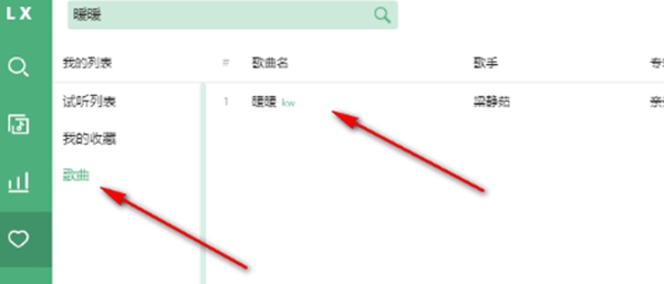 3.然后將音樂添加到新建的歌單中,然后在左側(cè)的愛心圖標(biāo)頁面中,就可以看到我們新建的歌單,點(diǎn)擊一下,就會(huì)看到我們導(dǎo)入的歌曲。