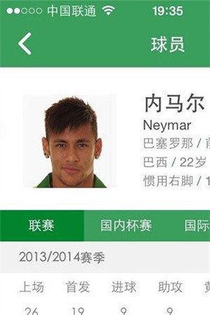 9、點(diǎn)擊一個(gè)球員的名字,就可以看到這名球員的數(shù)據(jù)了(以內(nèi)馬爾為例)
