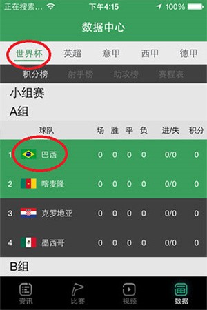 6、同樣的,在數(shù)據(jù)界面里,我們也可以查看世界杯各個(gè)參賽國(guó)的大名單。我們可以退回到數(shù)據(jù)的“世界杯”界面,點(diǎn)擊一支球隊(duì)(巴西隊(duì)為例)。