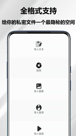 可在應(yīng)用內(nèi)對文本圖片音視頻文件進行加密,使用過程無需網(wǎng)絡(luò),文件大小沒有任何限制,支持直接拍照和錄制音視頻文件保存,并隨時可以刪除文件與解密還原文件,讓您數(shù)據(jù)安全無憂