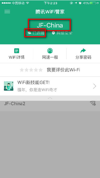 第三步,騰訊wifi管家app在成功幫助你連接下圖所示的wiif的時候,會出現(xiàn)下圖瑣事提示、這個時候如果你想要獲取改wifi的密碼告訴身邊的友人的話,不妨點(diǎn)下圖當(dāng)中所示的“獲取密碼”然后復(fù)制到任何一個可以輸入文本的地方粘貼就可以現(xiàn)實密碼詳情啦!例如“瀏覽器、微信、備忘錄等都可以”。