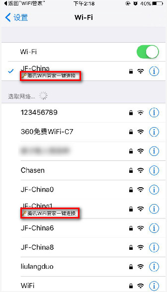 第二步,接下來會跳轉(zhuǎn)到系統(tǒng)的wiif列表當(dāng)中,如小編手機(jī)所示,如果周圍有 騰訊手機(jī)管家 wifi開放平臺加盟用戶,以及免費(fèi)的不要密碼的免費(fèi)wifi就會在此wifi下面現(xiàn)實“騰訊wifi管家一鍵連接”的字樣。大家點(diǎn)擊選中其中一個信號較強(qiáng)的wiif即可,騰訊wifi管家會自動幫助你連接此wifi。