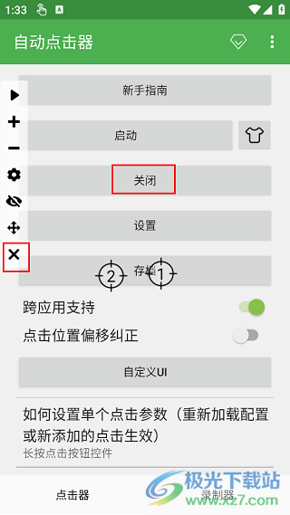7、自動(dòng)點(diǎn)擊的時(shí)候屏幕上無(wú)法再進(jìn)行其他的操作,需要先停止自動(dòng)點(diǎn)擊后才能繼續(xù)手工操作。啟動(dòng)鍵和停止鍵在同一個(gè)位置。不需要啟動(dòng)時(shí),點(diǎn)擊控制圖標(biāo)最下方的“X”即可退出自動(dòng)點(diǎn)擊器程序。