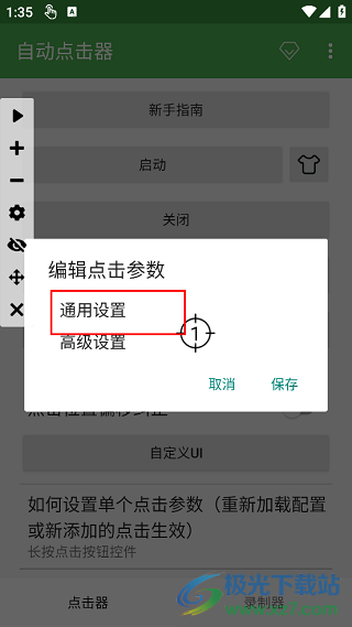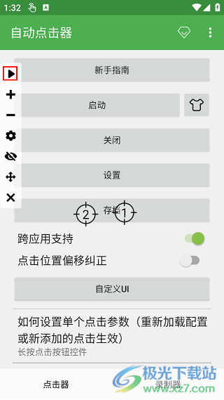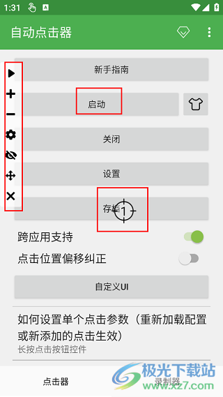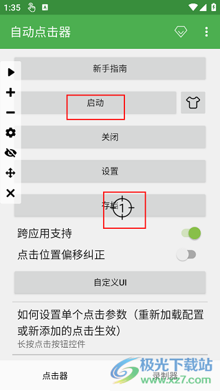 4、再回到首頁(yè),就能看到,“啟動(dòng)”項(xiàng)已經(jīng)可用了,點(diǎn)擊“啟動(dòng)”,打開自動(dòng)點(diǎn)擊器,屏幕左側(cè)會(huì)出現(xiàn)相應(yīng)的控制圖標(biāo)。