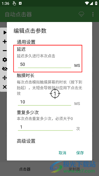 2、長(zhǎng)按點(diǎn)擊位置的控件會(huì)彈出單點(diǎn)的參數(shù)配置,可以設(shè)置單點(diǎn)的延遲,觸摸時(shí)長(zhǎng),重復(fù)次數(shù)