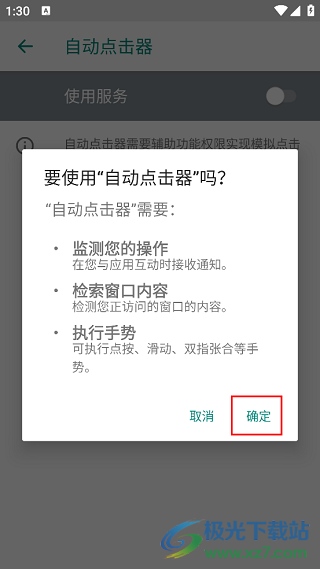 3、點(diǎn)擊自動(dòng)點(diǎn)擊器右側(cè)的按鈕,打開,提示窗口選擇確定。