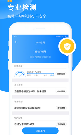 不止是這樣,WiFi鑰匙還內(nèi)置WiFi測速功能,一鍵檢測WiFi信號(hào)強(qiáng)弱,秒變 wifi信號(hào)增強(qiáng)器 !一個(gè)APP3個(gè)角色扮演,做你貼心的WiFi管家!